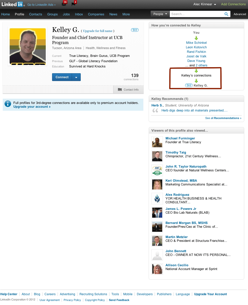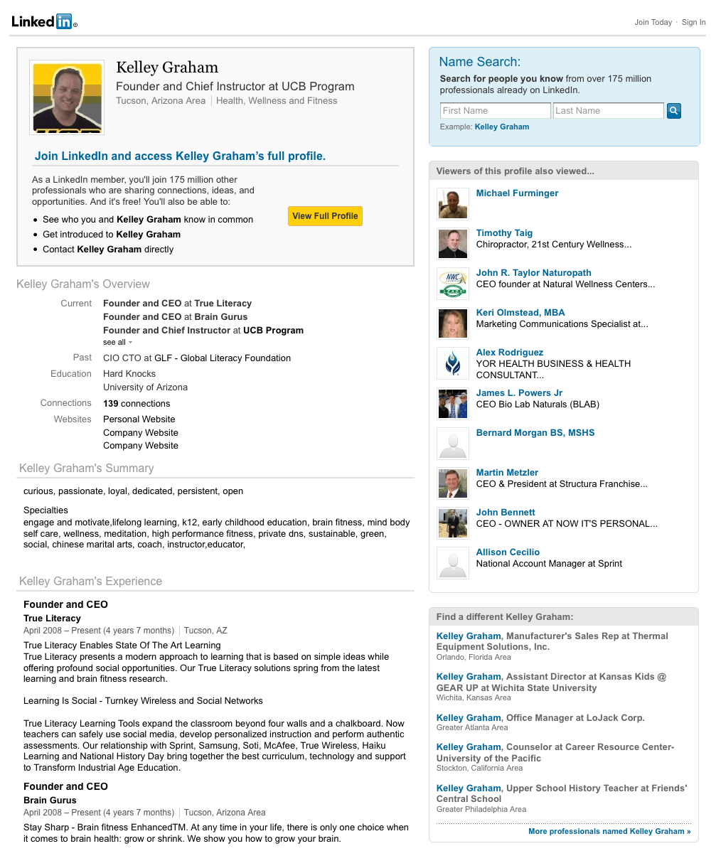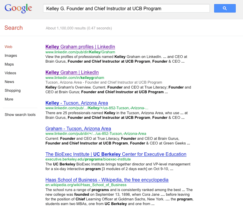 Here’s a search for what’s available when logged in to LinkedIn: http://www.google.com/search?q=Kelley+G.+Founder+and+Chief+Instructor+at+UCB+Program