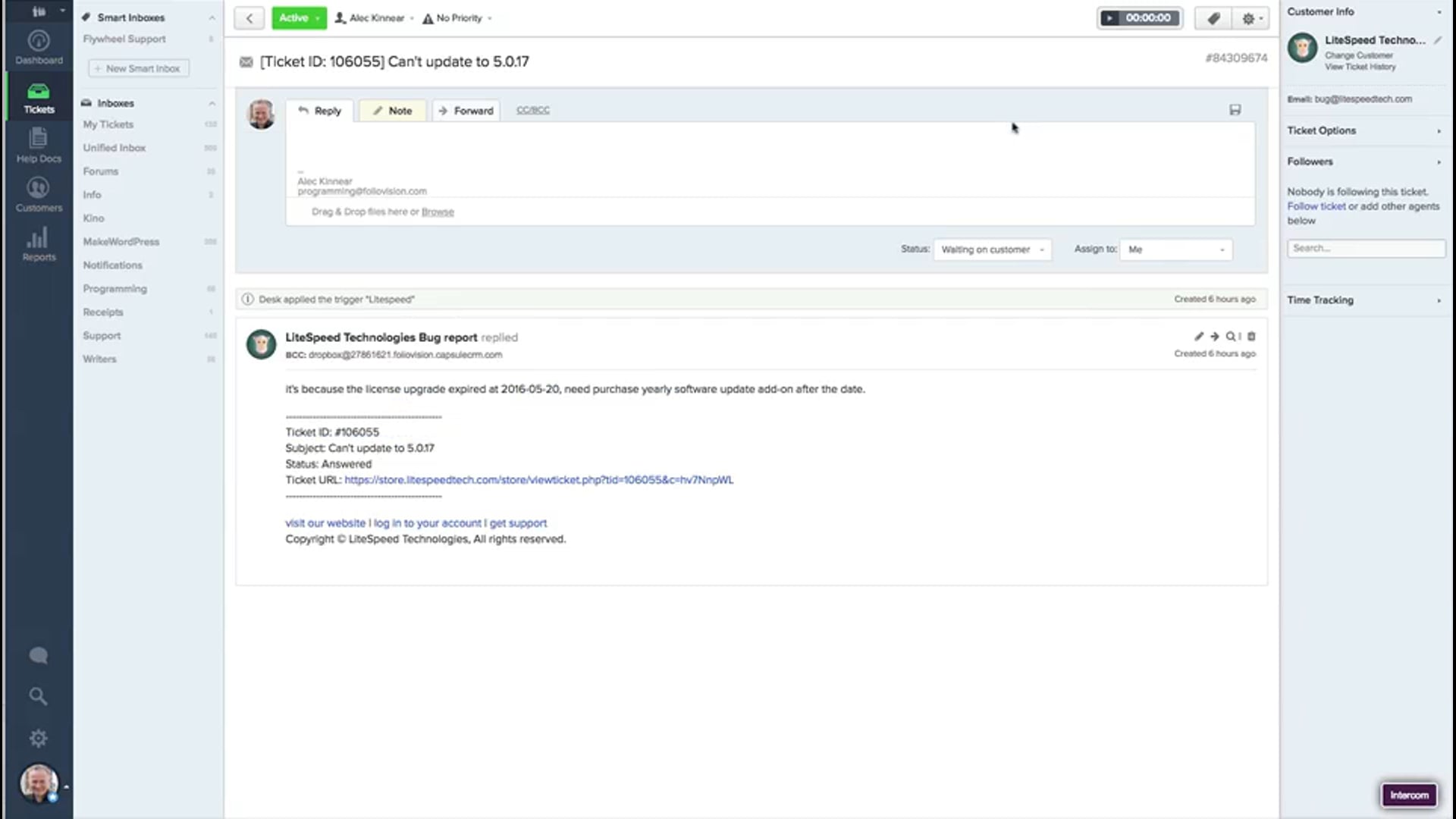 První video zobrazuje pomalé připojení v Chromium 49 na 15Mbps kabelovém připojení. Klikl jsem na oznamovací email v Apple Mail pro otevření tiketu.