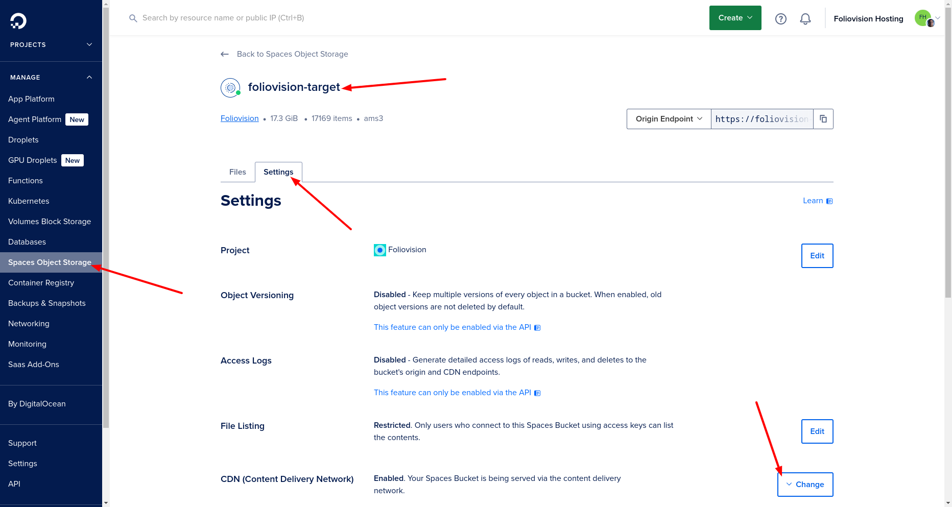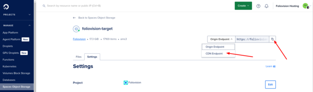 First you would have to find your “target” or “encoded” videos Space in DigitalOcean and enable CDN for it.